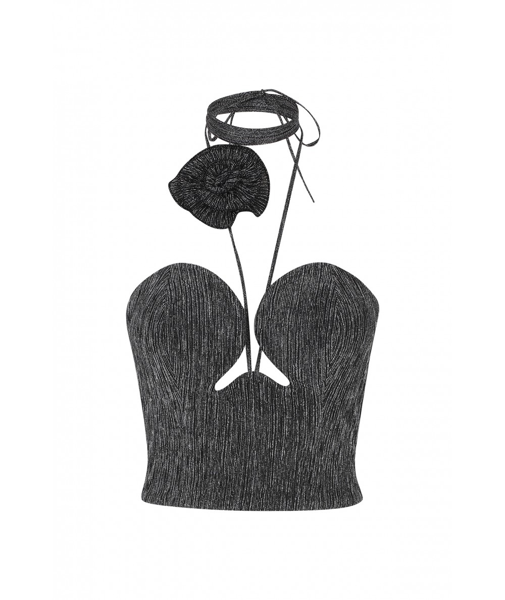 Gül detaylı, boyundan bağlamalı ve balenli büstiyer