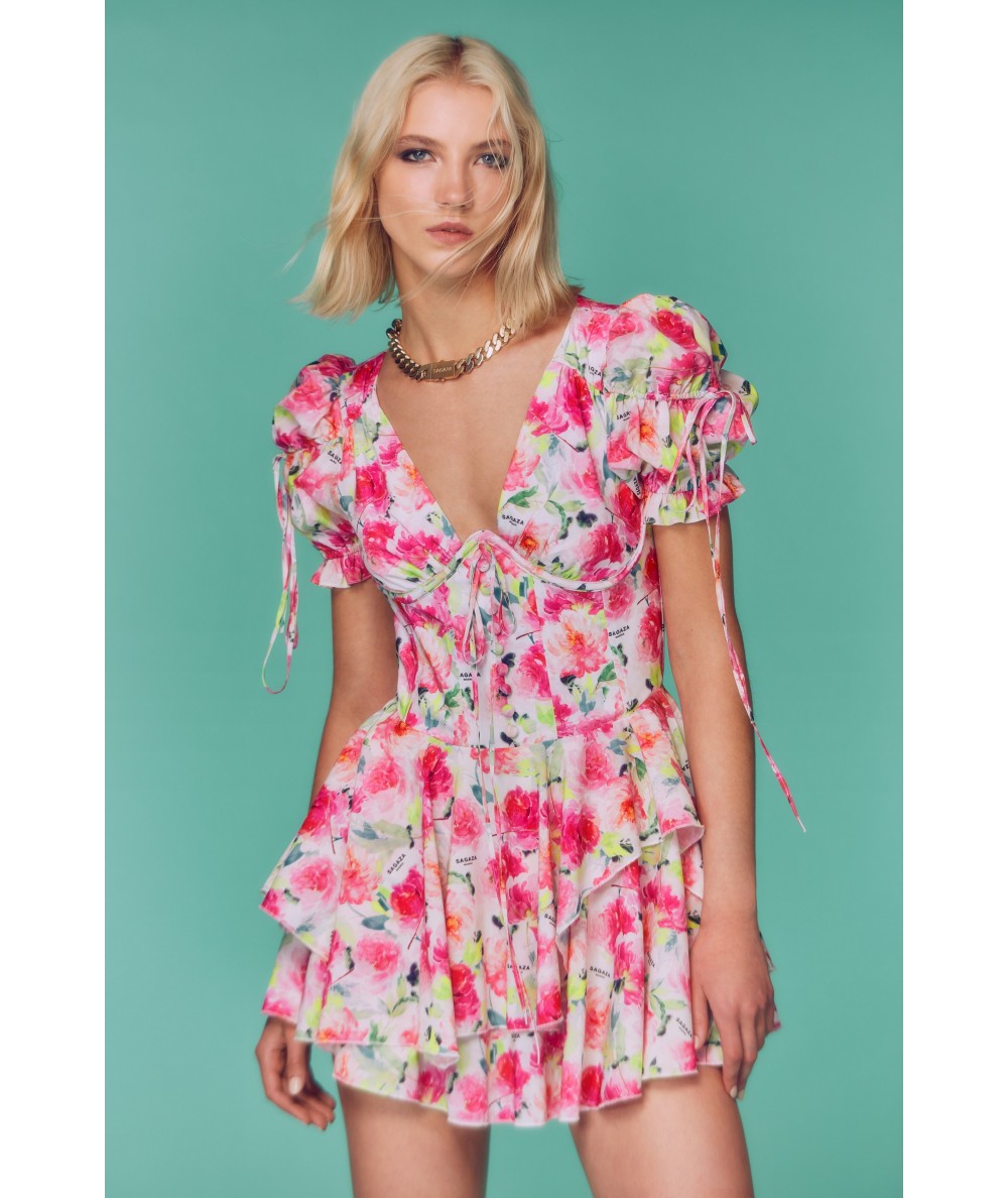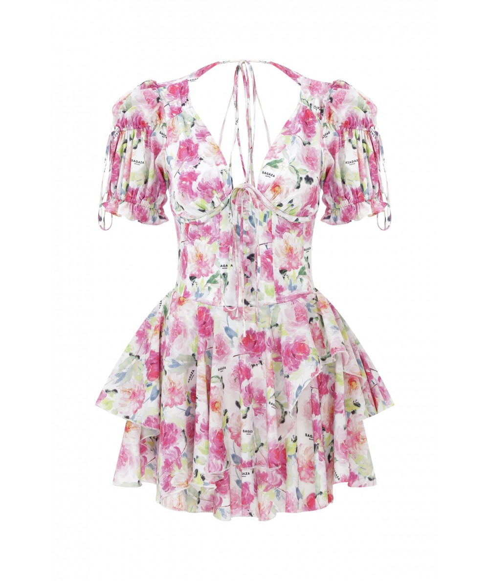 Göğüs Balen Detaylı Küçük Sagaza Baskılı Volanlı Elbise.