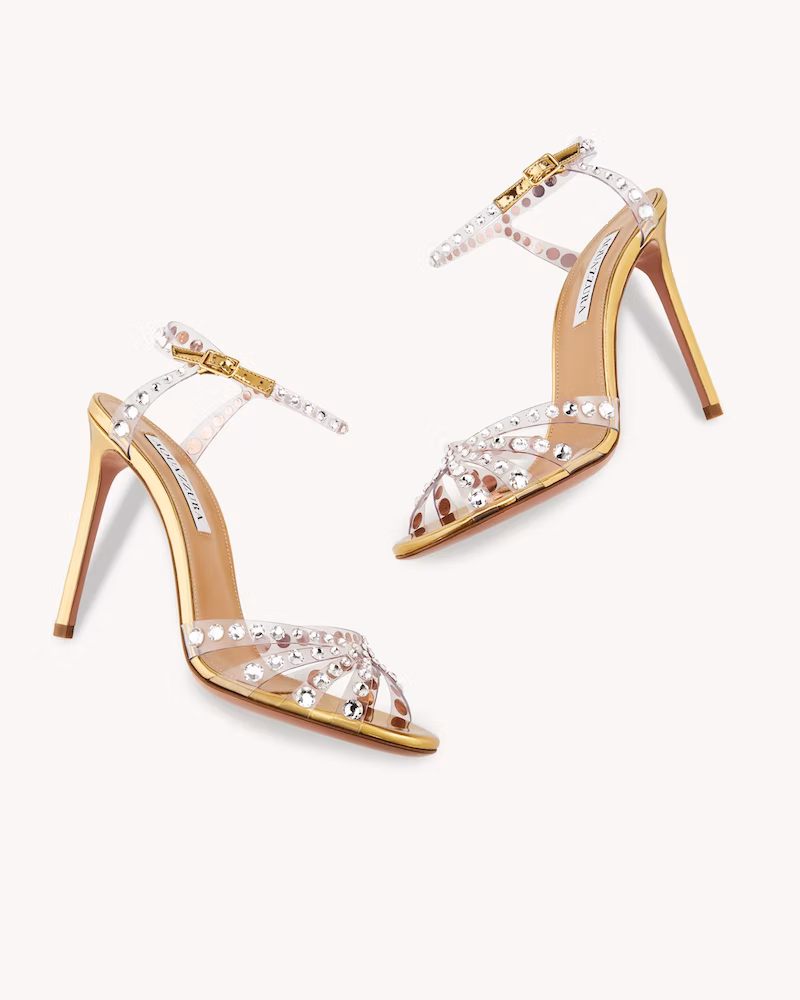 Stand tall in our 70's inspired Moon Sandal Plateau. Made in Italy from lustrous metal terrazo in golden platino, the style has slender straps that wrap the toes, an adjustable ankle strap and is set upon a chunky, sky-high heel. Wear yours with a floaty dress.