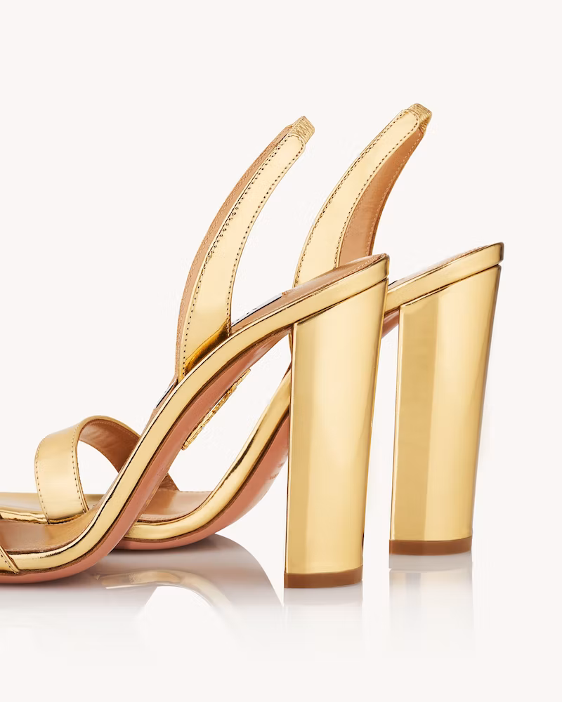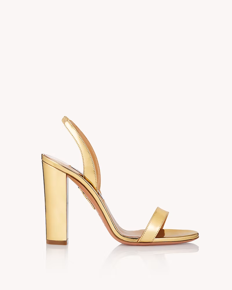 Our Tiara Slings ensure an elegant stride after dark. Made in Italy from luxe fine mesh and laminated nappa in luminous champagne, the slingback silhouette is embellished with glittery gems and is finished to a sharp, pointy toe. Style yours with a chic mini.